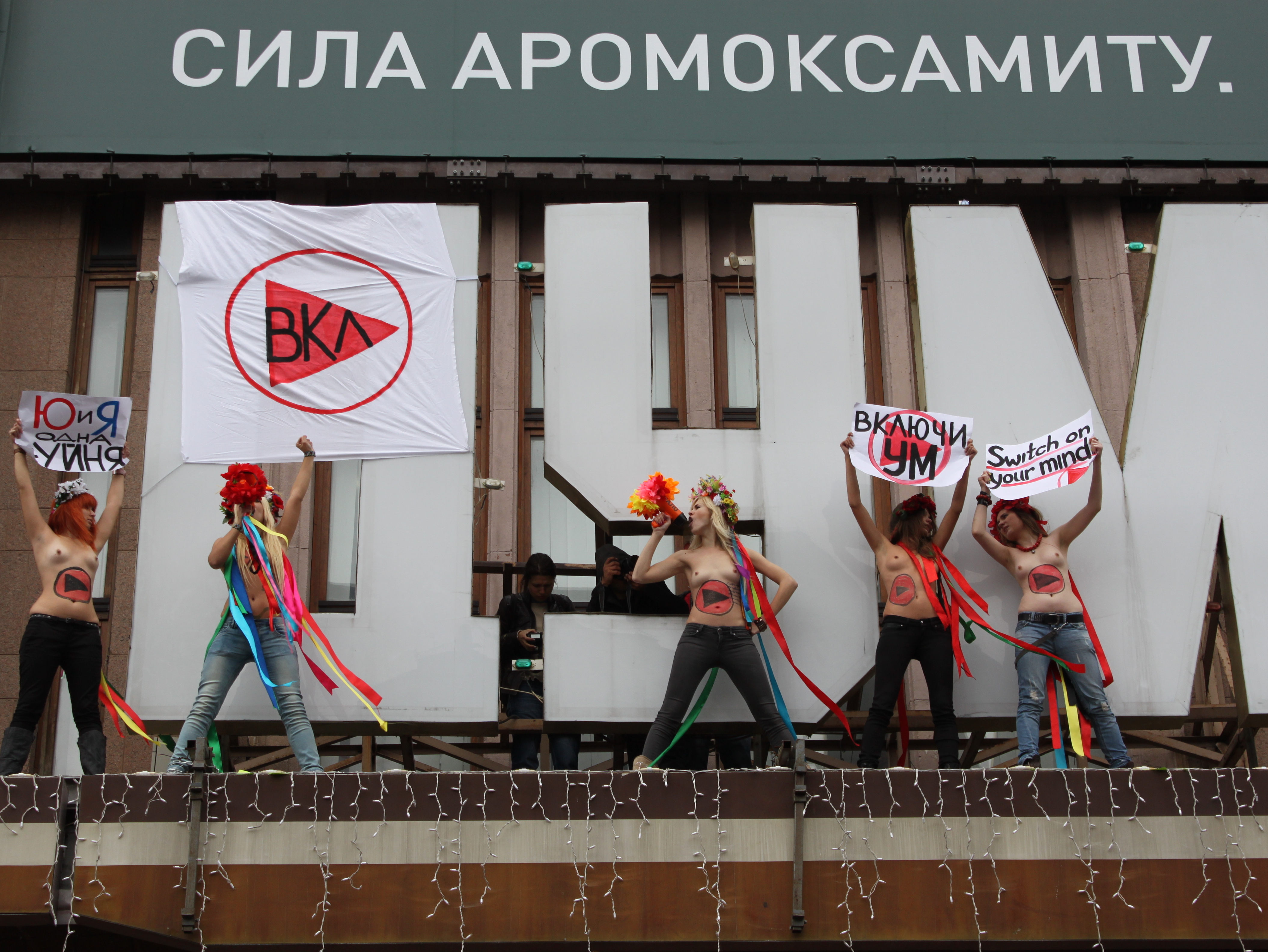 Однако скоро акция была пресечена. Сотрудники милиции задержали пятерых активисток, погрузили в автозак и увезли.