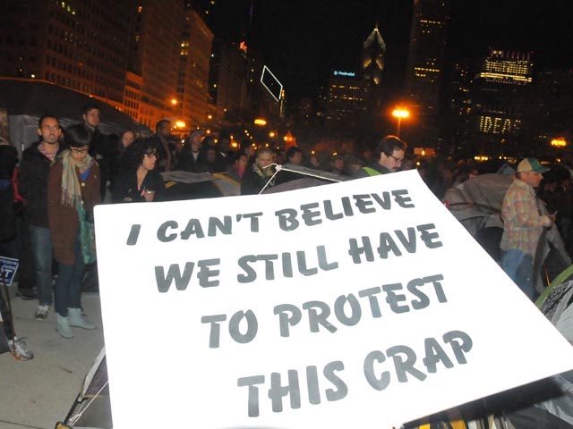 В субботнем марше приняли участие более 2 тысяч человек. Дойдя до Грант-парка, они развернули на его территории палаточный городок. Однако, протестующие были вытеснены оттуда полицией на основании местного закона, запрещающего находиться в парке после полуночи. По словам официальных представителей стражей порядка, задержанные 175 человек отказывались покидать территорию парка и "неоднократно игнорировали предупреждения полиции".