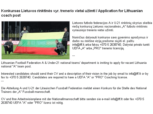 Федерация футбола Литвы (ФФЛ) объявила открытый конкурс на занятие места главного тренера национальной сборной. Соответствующее объявление размещено на официальном сайте федерации на литовском, английском и немецком языках.