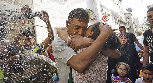 Наблус, Западный берег. Освобожденного из тюрьмы Фотна Абу Алейна (слева) встретила родная сестраНовый поворот? На митинге в Газе 18 октября глава правительства ХАМАСа Исмаил Хания и двое его сподвижников — Махмуд аз-Захар и Ахмад Бахар — приветствовали «борцов за свободу Палестины». Хания объявил о выплате каждому арабскому «герою» по $2 тыс. Первую группу выпущенных из израильских тюрем — 327 человек — разместили в четырехзвездном отеле «Аль-Машталь» в Газе. Утром 19-го они сделали физзарядку около роскошного бассейна с видом на Средиземное море и проследовали в ресторан на специально сервированный завтрак. Потом состоялись парад освобожденных и торжественный митинг, который открыл глава Палестинской автономии Махмуд Аббас. Командовали парадом стоявшие рядом с ним руководители Движения исламского сопротивления. Зеленых флагов ХАМАСа было заметно больше, чем желтых флагов ФАТХа, красных — Демократического фронта освобождения Палестины (ДФОП) и других организаций. По завершении парада руководство ХАМАСа объявило в Газе трехдневные торжества и отправилось раздавать комментарии прессе. Исмаил Хания назвал сделку по обмену «стратегическим поворотом в конфликте с сионистским врагом». При этом он косвенно упрекнул Аббаса за готовность «согласиться на Палестину в границах 1967 года»