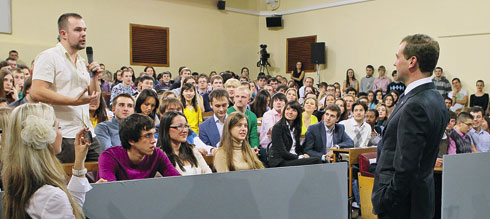 | Пока студентов журфака задерживали за неудобные вопросы президенту, Дмитрий Медведев в аудитории факультета общался со специально подобранными под мероприятие «нашистами» (верхний снимок) |