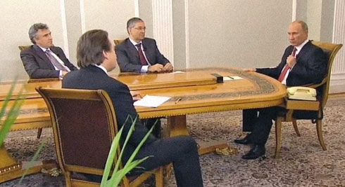 Встреча с Путиным: подчиненные на приеме у начальникаНа приеме у Путина Совсем другое дело — встреча Владимира Путина с руководителями трех основных общенациональных телеканалов Константином Эрнстом, Олегом Добродеевым и Владимиром Кулистиковым. Здесь модернизацией и не пахло. Автор давно — еще не став телекритиком The New Times — обратил внимание, что силами телевизионной картинки Медведева и Путина тщательно разводят по разным имиджевым нишам и тем самым — по разным углам российской политической сцены. Медведев с его нарочито современными примочками и образом старшего друга, только что вернувшегося из похода, — это инновации, будущее и сигнал продвинутой части общества. Путин, напротив, это пыльные, soviet style тяжеловесные интерьеры и поза товарища К.У. Черненко на избирательном участке — разве что, опять же, молодого Черненко, и не помышляющего об эмфиземе легких. Формально Путин как будто позаимствовал формат общения с тремя гендиректорами у Медведева. Но фактически интервью будущего президента было обставлено совсем иначе. Если уходящий президент говорил с уважаемыми гостями за круглым столом, акцентируя принадлежность к одной социальной страте и статус «первого среди равных», то приходящий выглядел классическим большим начальником, на прием к которому пришли робкие подчиненные. Комната в путинской резиденции «Ново-Огарево» являла собой типичный старомодный кабинет руководителя. Сам руководитель — во главе стола, подчиненные (гендиректоры) — по флангам. Одесную бога — Добродеев и Кулистиков, ошуюю — одинокий Эрнст (видимо, так была продемонстрирована особая симпатия главначальника к гендиректору Первого). Начиналось интервью с путинского «Слушаю вас» — ну точно скучающий бюрократ собрался выслушивать невыносимый лепет давно надоевших просителей.