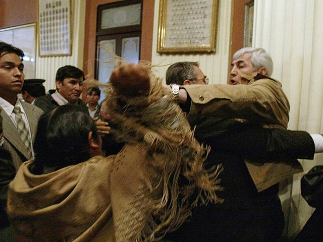 Четвертое место, судя по расположению фото, у боливийских политиков. На нем боливийский оппозиционный конгрессмен Фернандо Родгирес (справа) вступил в битву с неопознанным представителем партии президента Эво Моралеса во время заседания конгресса в Ла-Пасе в 2009 году.