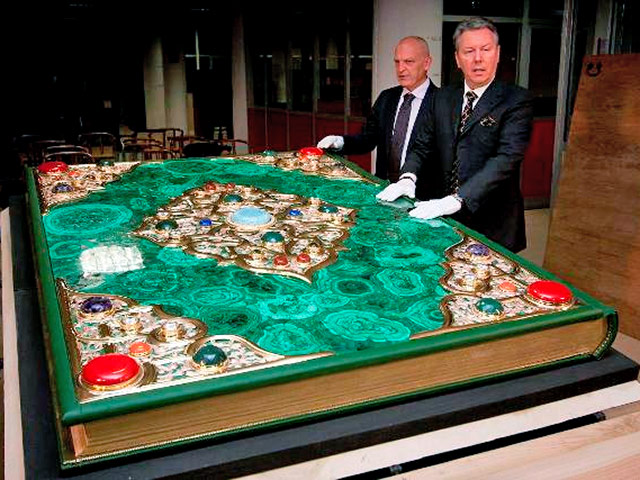 Этот Коран, изготовленный итальянской компанией "Реверра ЛТД", имеет размеры 150 x 200 см и 632 страницы. А весит он 800 кг. Его страницы изготовлены из шотландской бумаги, а обложка - из малахита, полудрагоценных камней, фианитов, яшмы, сусального золота и серебра, сообщает сайт мэрии Казани со ссылкой на пресс-службу Духовного управления мусульман Татарстана.