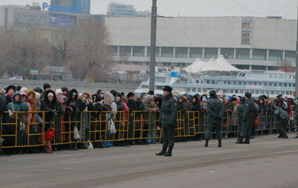 Число людей, пришедших поклониться поясу Богородицы, потрясает воображение: только перестроечные демонстрации собирали такие толпы, других случаев не припомню. Вот почему показалось важным из первых рук узнать, что понуждает людей долгими часами выстаивать в очереди к храму Христа Спасителя. Всем я задавала один и тот же вопрос: почему вы здесь? Что вас привело сюда? Опрос проводился в пятницу, с 13.50 до 14.40. Когда я пришла, «стояние» начиналось на Пречистенской набережной, в районе станции метро «Парк культуры»; когда уходила — хвост очереди перекинулся уже на Фрунзенскую набережную. Никаких «ужасов» мне наблюдать не пришлось: полицейские были в высшей степени доброжелательны и вежливы, люди спокойны, правда, я разговаривала в основном с теми, кто только что подошел. Вдоль набережной стояли палатки с булочками и еще какой-то снедью, на некоторых висело объявление «Чай бесплатно».