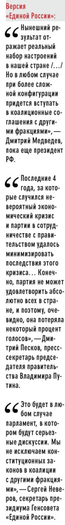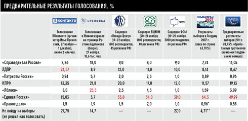 Однако проблемы вертикали власти дали о себе знать даже в лояльных регионах: «Единая Россия» значительно просела в Кабардино-Балкарии (потеря — 18%), в Башкортостане (минус 13%), а в Свердловской области партия власти набрала в сравнении с 2007 годом вдвое (sic!) меньше голосов, 32% вместо 63% (репортаж о сопротивлении в Екатеринбурге — на стр. 10). Протестная волна, поднятая в интернете, дала себя знать: даже прокремлевские аналитики в прямом эфире государственного канала «Россия 1» признали: за «ЕР» голосуют те, для кого мизерные прибавки к зарплатам и пенсиям — возможность выжить, молодежь, которая в прошлом не ходила на выборы, составила основную волну сопротивления. Это было особенно видно в крупных городах: в Петербурге «ЕР» потеряла свыше 25%. В Москве — 12%, несмотря на массовые вбросы: по данным exit-поллов партия власти набирала в столице не больше 25%. Сейчас уже очевидно: стратегия Навального — голосовать за любую преодолевающую 7% барьер партию, кроме ПЖиВ, — сработала. Ее бенефициарами стали прежде всего КПРФ (они улучшили свой результат 2007 года почти на 8%) и «Справедливая Россия», шансы которой еще 2 месяца назад на прохождение в Госдуму казались почти нулевыми — скорее всего, она станет третьей по числу мандатов фракцией на Охотном Ряду (в 2007-м — четвертая), обойдя ЛДПР Жириновского. Наконец, партия «Яблоко», хотя и не прошла в федеральный парламент, набрала неожиданные 10,5% в Законодательное собрание Северной столицы.