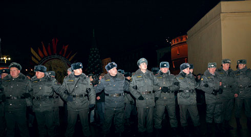 «Дальние подступы» к Кремлю весьма качественно перекрыты полицейской «пехотой»: возле метро у подземных переходов стоит оцепление, вдоль Манежной площади с той стороны проезжей части с интервалом 8–10 шагов выстроились бойцы в серых плащ-накидках. На площади между гостиницами «Москва» и «Метрополь» ровными рядами стоят «КамАЗы» дивизии внутренних дел из Балашихи