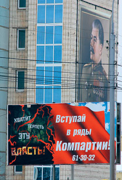 Впервые герб повстречался около механического завода, но в поле зрения попал не только он. Попросила таксиста остановиться и долго протирала глаза. Напротив герба с короной красовался большой парадный портрет вождя народов товарища Сталина. Рядом со Сталиным висела предвыборная агитация партии власти, утверждавшая, что это именно она построила за отчетный период мост через Волгу, открыла две с чем-то тысячи мест в детских садах и высадила в городе 380 тыс. деревьев. «Сколько народу живет в Ульяновске?» — спрашиваю таксиста. «780 тыс., — рапортовал таксист и, увидев одобрительную реакцию, добавил: — Я вообще-то танкист, а таксистом подрабатываю».