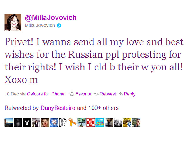 Голливудская звезда российского происхождения Мила Йовович написала в своем Twitter, что поддерживает выступления митингующих в России.
