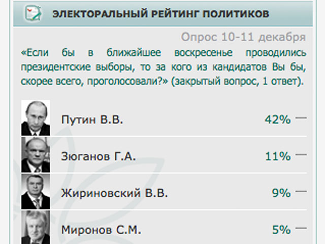 "Путин остается лидером. Он имеет существенный отрыв от всех остальных претендентов на президентский пост в 2012 году. Результаты парламентских выборов повлияли на его личный рейтинг, но несущественно", - заявил Федоров.