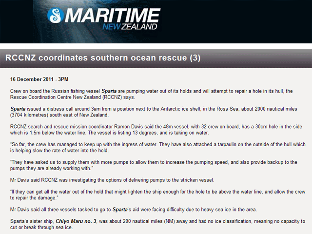 Как сообщалось, российское рыболовное судно "Спарта" (порт приписки Советская Гавань Хабаровского края) передало сигнал бедствия по спутниковой связи около 19:00 по Москве 15 декабря из моря Росса. Южноафриканское радио передает данные новозеландского Центра координации о том, что судно "Спарта" получило пробоину ниже ватерлинии и тонет. Подаваемые российскими моряками сигналы бедствия были приняты в Норвегии и переданы в новозеландский Веллингтон.