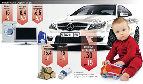 То же самое будет происходить и с Россией: у нас нет таких групп товаров, по которым в течение года-двух произойдет резкое снижение импортных пошлин, приводящее к падению цен. Наоборот, по тем товарам, по которым предполагается самое значительное снижение тарифов, предусмотрен наиболее длительный переходный период. Так, импортные пошлины на новые автомобили сразу при присоединении к ВТО уменьшатся с 30% до 25% и в течение 3 лет останутся на этом уровне. После этого пошлины будут снижаться на 2,5% в год, пока через 7 лет не достигнут отметки в 15%. Никаких обязательств по дальнейшему изменению тарифов Россия не имеет. На подержанные автомобили до 7 лет при присоединении к ВТО будет установлена пошлина 25%. Она не будет меняться 5 лет, а затем в течение 2 лет снизится до 20%. На автомобили старше 7 лет пошлина меняться не будет. Поэтому потребители вряд ли быстро увидят заметное снижение цен, ведь надо учитывать влияние инфляции. Правда, есть надежда, что цены на эти товары будут расти медленнее, чем инфляция в целом.