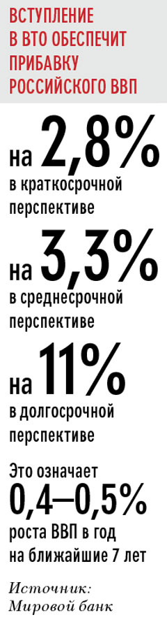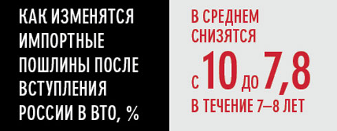 Другая страна? Конечно, это не означает, что на следующий день после присоединения к ВТО россияне проснутся в другой стране. Один из основополагающих принципов работы Всемирной торговой организации — медленные, постепенные изменения, без шоковых последствий. Задача ВТО — либерализация торговли, но не путем принесения в жертву национальных экономик, а за счет их гармоничного развития. Как правило, стране предлагается переходный период — 5–8 лет, в случае развивающейся страны — может быть, и больше. В течение этого срока показатели торговой политики и импортно-экспортные пошлины постепенно доводятся до целевых параметров, о которых страна договорилась при вступлении в ВТО.