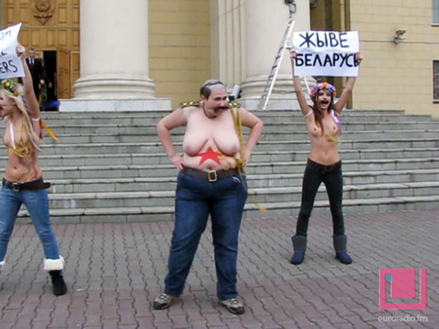 Активистки FEMEN, раздевшись по пояс, провели акцию у здания КГБ Белоруссии 19 декабря, в годовщину разгона несанкционированного митинга оппозиции после президентских выборов. Одна из девушек была загримирована под президента Александра Лукашенко, еще две активистки прицепили усы в стиле белорусского лидера. В руках феминистки держали плакаты "Жыве Беларусь!" и Freedom to political prisoners - целью акции было потребовать освобождения политзаключенных в Белоруссии.