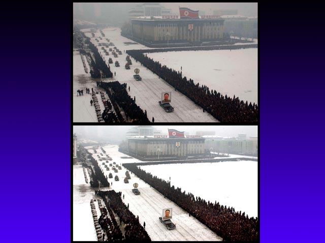Пышные похороны почившего северокорейского вождя Ким Чен Ира вызвали в мире немало вопросов. В первую очередь аналитики, конечно, принялись гадать о возможных переменах в политике КНДР. Однако вопросы возникли и к организации самой траурной церемонии: как выяснилось, на официальных снимках не обошлось без ретуши. В частности, северокорейские специалисты "вырезали" с фото съемочную группу, снимавшую проезд по площади траурного кортежа.
