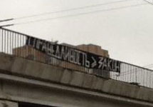 Перед рассмотрением жалобы на эстакаде рядом с Тверским судом, на пересечении Цветного бульвара и Садового кольца, неизвестными была вывешена растяжка "Справедливость > закон".