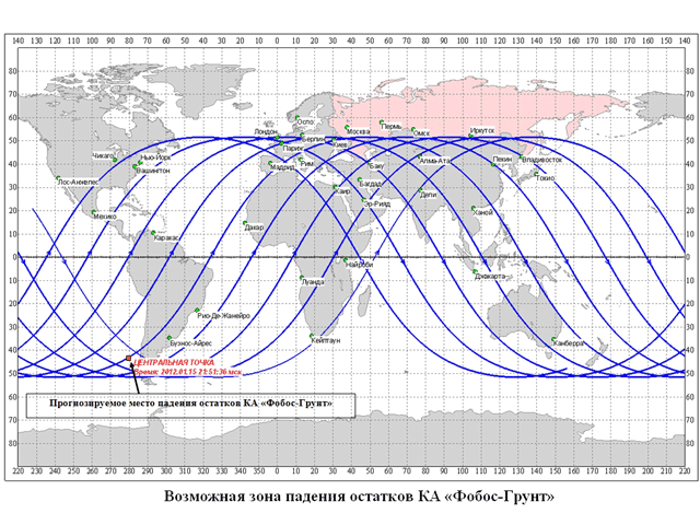 В пятницу Роскосмос объявил, что "Фобос-Грунт" упадет в Атлантический океан, а днем ранее наиболее вероятным районом считался Индийский океан - самый маленький из трех возможных.