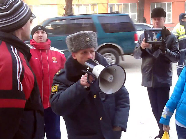 Спустя пять минут поклонов и благодарностей появился человек с плакатом, на котором было написано "Спасибо дяде Сэму, дуракам нужна революция". Это позволило полиции объявить мероприятие несанкционированным митингом и задержать организаторов. Человека с плакатом также доставили в отделение полиции.