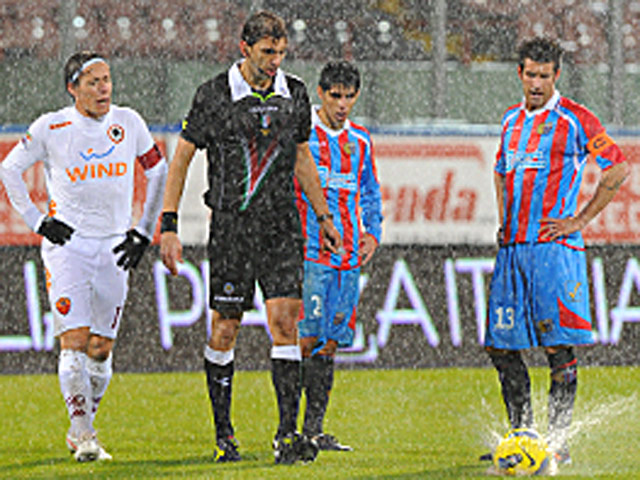 Сильнейший ливень стал причиной сначала приостановки, а затем отмены матча футбольного чемпионата Италии между "Катанией" и столичной "Ромой".