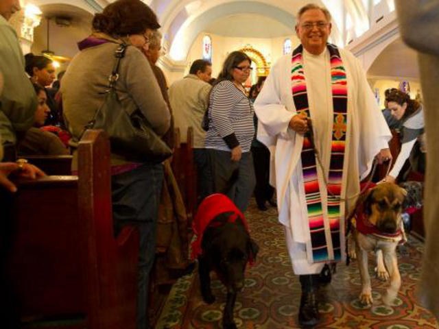 В одном из католических храмов на юге США священнику прислуживают на мессе и помогают в повседневных пасторских заботах собаки.