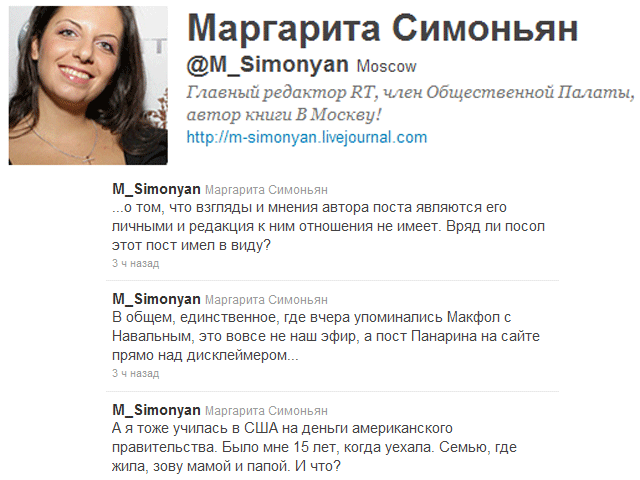 Но еще через час главный редактор признала, что упоминание Макфола с Навальным на RT все же было в записи Панарина - "на сайте прямо над дисклеймером". Главред напомнила, что "взгляды и мнения автора поста являются его личными и редакция к ним отношения не имеет". "Вряд ли посол этот пост имел в виду", - недоумевает Симоньян.