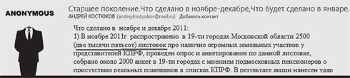 поднималась тема связей «Наших» и Василия Якеменко с футбольными фанатами, которых задействуют для силовых акций. И глава Росмолодежи, и лидеры других прокремлевских движений подобные контакты всячески опровергали, но теперь они получили фактическое подтверждение — из вскрытой переписки следует, что мобильные боевые группы готовились и к декабрьскому голосованию, формируются и сейчас. 4–6 декабря «Наши» проводили на ВВЦ свой «Зимний Селигер». «Мы договаривались о крепких спортивных ребятах на форум. От нас будет 100 человек из Ярославля и 40 от Тулы, — написал Василию Якеменко за две недели до парламентских выборов лидер движения «Сталь» Олег Соколов. — Будет для них какое-то задание и должны ли они быть в Москве раньше 4 декабря?» С этими крепкими ребятами оппозиционеры и столкнулись на Триумфальной площади 6 декабря. «Продолжаю работу по созданию силового блока организации, людей из «Старшего поколения», способных к физическому противостоянию на улице, способных кинуть палку или помидор, — написал главе Росмолодежи месяц назад, 10 января 2012 года, координатор организации помощи ветеранам и пенсионерам «Старшее поколение» Андрей Костюков. — Основная силовая команда сосредоточена в городе Щелково (около 70 человек!), начал усиленную работу в этом направлении в Королеве и Балашихе». В своем отчете тому же Якеменко от 30 декабря Костюков рассказывает о проделанной в ноябре-декабре 2011 года работе: накануне выборов активисты раздавали антикоммунистические листовки, участвовали в митинге «Единой России» на Манежной площади 12 декабря, участвовали в телепередачах и собирали у ветеранов подписи под письмом против Алексея Навального. О помощи ветеранам и пенсионерам в отчете нет ни слова, зато Костюков честно признает: «Основная деятельность в январе-феврале 2012 года будет связана с президентской избирательной кампанией». На свой проект «Старшее поколение» Костюков запросил только на январь — 1 млн 540 тыс. рублей, а на весь 2012 год — 18 млн 480 тыс.