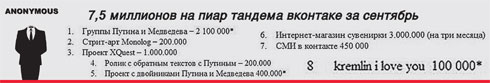 500 тыс. рублей на покупку блогов, 800 тыс. — на комментарии, бюджет пресс-службы движения — 830 тыс., 250 тыс. — на Facebook Путина, которого у него пока даже нет