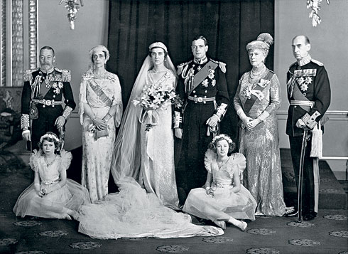 Снимок со свадьбы принца Георга, герцога Кентского (третий справа) и Марины, принцессы Греческой и Датской. Стоят (слева направо): король Георг V, Екатерина, принцесса Греческая; справа налево: Николай, принц Греческий, королева Мэри.Маленькая Елизавета (сидит на полу слева) была на этой свадьбе подружкой невесты. 1934 г. Она сама пела гимн первые 26 лет своей жизни. Только тогда в тексте было другое слово — «король» вместо «королева». 6 февраля 1952 года ее разбудил телефонный звонок. Именно тогда она впервые услышала обращенное к ней почтительное: «Ваше Величество». Смерть отца, короля Георга VI, в возрасте всего лишь 59 лет застала его старшую дочь принцессу Елизавету в Кении, где она с мужем принцем Филиппом остановилась на пути в Австралию. Кончина отца была неожиданной. Молодая Елизавета не могла предполагать, что на ее плечи так быстро свалится груз одной из самых тяжелых профессий в этом быстро меняющемся мире — работать символом нации, ее истории, традиций, знаний и ценностей.