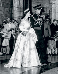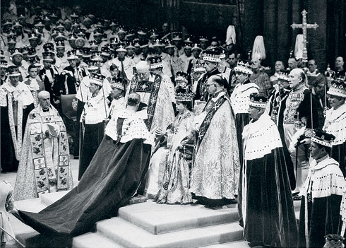 Лондон, Вестминстерское аббатство. Момент коронации: Елизавета II (на троне) принимает клятву верности от супруга, герцога Эдинбургского (в мантии). 2 июня 1953 г. Королева — верховный главнокомандующий, ей и только ей приносят присягу солдаты и офицеры, но она не может приказать ни одному из них взять оружие и выступить в поход.