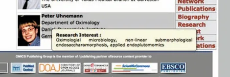 А очередной замечательный анекдот только что рассказал в своем блоге Джонатан Айзен, яркий приверженец модели свободного доступа, один из основателей Public Library of Science и главный редактор PLoS Biology [6]. В редколлегии журнала Molecular Biology (не путать с переводной версией российского журнала «Молекулярная биология», издаваемой Springer) числится Питер Унеманн (Peter Uhnemann) с факультета Оксимологии (так!) Университета Daniel-Duesentrieb (это немецкое имя одного из диснеевских персонажей). В биографии Унеманна на сайте журнала сказано, что после окончания университета он работал в области мультиплагиарической высокопроизводительной копилогии (так! multiplagiatric high-throughput copyology) и спамологии, является членом редколлегий Journal of Scientific Highthroughout Spamology и Journal of Junk Publications, а также лауреатом премии «Вымышленная персона года» в 2011 году.