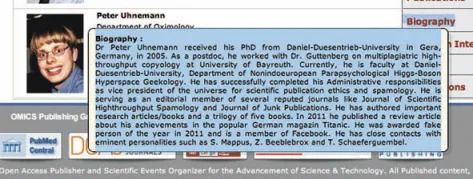 6. J. Eisen. Scary and funny: functional researcher Peter Uhnemann on OMICS group Editorial Board. The Tree of Life (01.30.2012) http://phylogenomics.blogspot.com/2012/01/scary-and-funny-functional-researcher.html