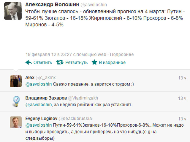 Бывший глава администрации президента России Александр Волошин прочит кандидату в президенты Владимиру Путину победу в первом туре выборов. "Чтобы лучше спалось - обновленный прогноз на 4 марта: Путин - 59-61%; Зюганов - 16-18%; Жириновский - 8-10%; Прохоров - 6-8%; Миронов - 4-5%", - написал Волошин в своем микроблоге в Twitter.