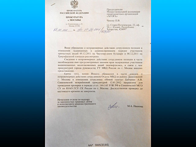 Расследованием этих задержаний занималась правозащитная Ассоциация "Агора". Ее юристы и получили ответ от начальника отдела по надзору за законностью правовых актов и исполнением административного законодательства прокуратуры Москвы Марины Ивановой. Публикуется его фотокопия.