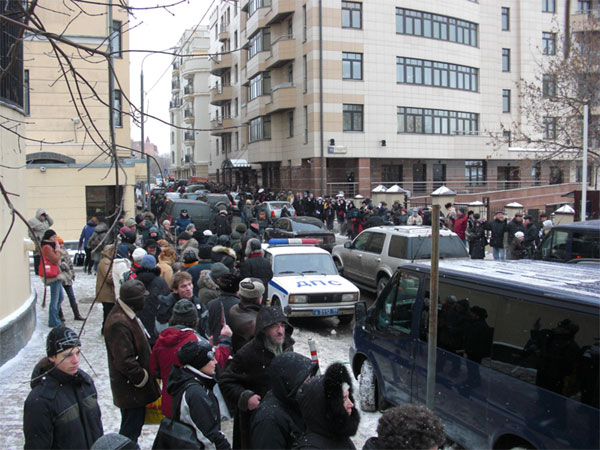 15 декабря люди пришли к Хамовническому суду, где должны были огласить приговор по второму делу "ЮКОСа". Полиция не согласовала пикет. В какой-то момент люди молча взялись за руки. Заранее об этом никто не договаривался. Цепочки протянулись по обе стороны переулка.
