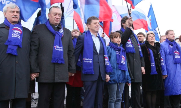 Ровно за месяц до последних думских выборов, в День народного единства, живую цепь на берегу Невы выстроили единоросы и мгеровцы. По официальным данным, в акции "Единый город" участвовало более 8 тысяч человек, корреспонденты независимых изданий считают эту оценку сильно завышенной. Сторонники "ЕдРа" опоясали Английскую и Университетскую набережные, Благовещенский и Дворцовый мосты.