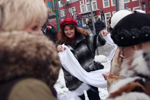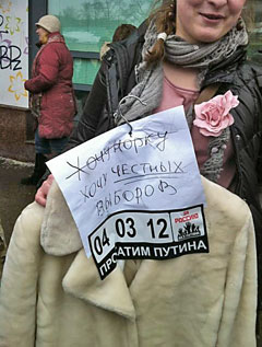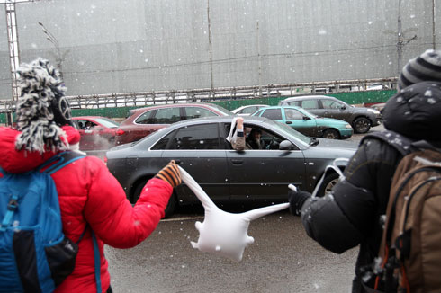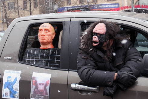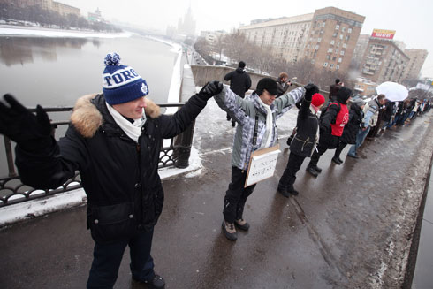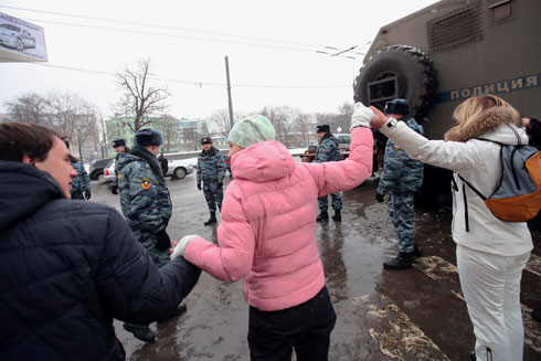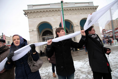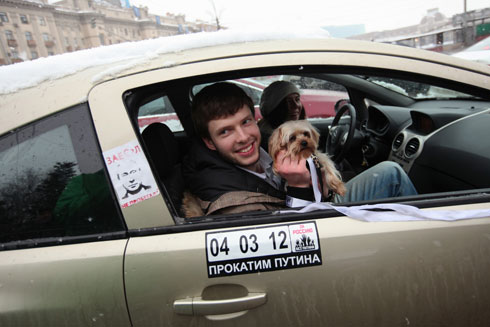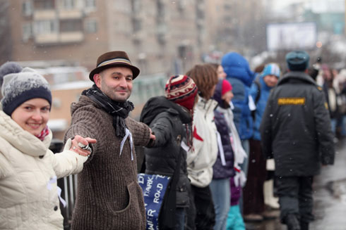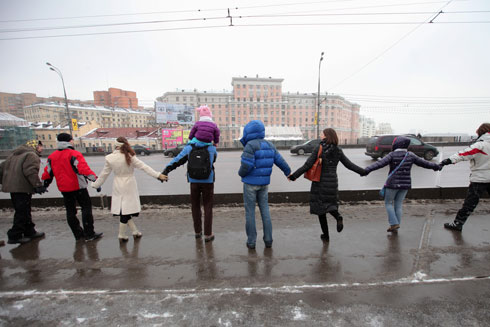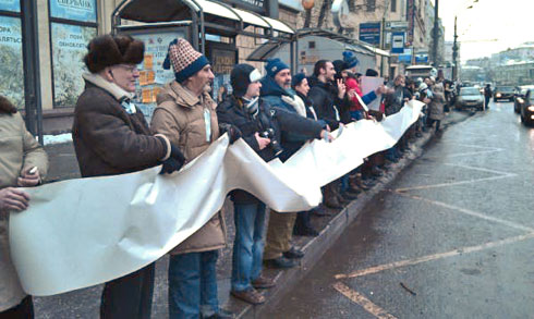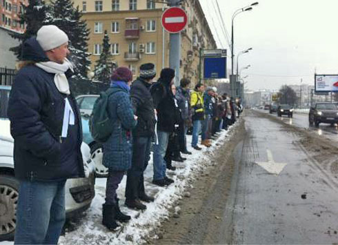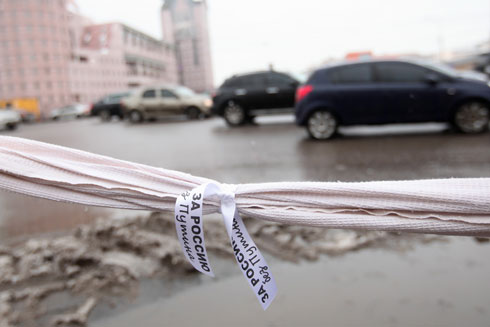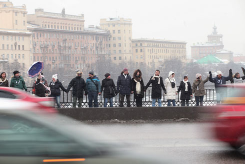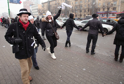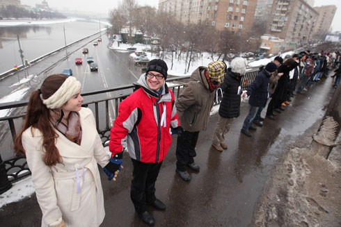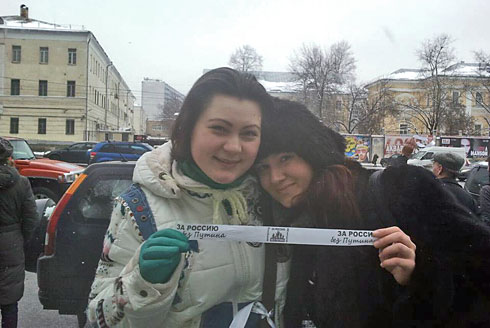 Сторонники Владимира Путина там же на Садовом кольце раздавали прохожим ленточки в поддержку премьер-министра и кандидата в президенты. У метро «Парк культуры» они пытались организовать параллельную оппозиции цепь.