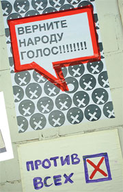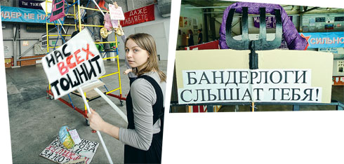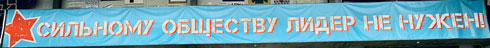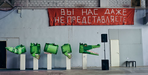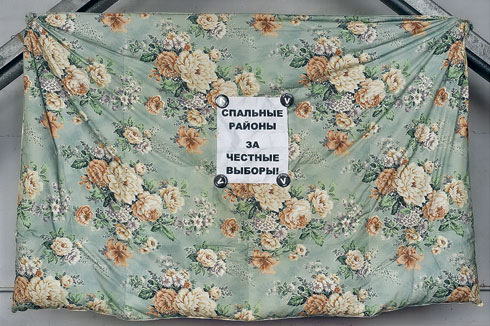 Организаторы выставки — портал OpenSpace — искали экспонаты через интернет. «Мы, к сожалению, не можем стопроцентно гарантировать их музейной сохранности, хотя мы будем очень стараться», — говорилось в объявлении. Произведения, принесенные авторами, заняли два этажа большого зала, включая лестницу. Таблички на листах офисной бумаги, прикрепленные к лестничным перилам, оказались очень удачным элементом дизайна, продолжив и подчеркнув ритм ступенек. Растянутые вдоль перекрытий красочные полотнища: голубое — «Сильному обществу лидер не нужен», коричневое — «Брейвик! Тебя ждут на Селигере» (шутка вообще-то так себе), красное — «Вы нас даже не представляете» и ответное сиреневое «Мы представляем себя» — составили настенный ансамбль современных политических панно. Пара дорожных указателей, которыми обозначаются населенные пункты: «Путин» и перечеркнутая красной чертой «Надежда» — украсили низкую белую батарею. Словом, на выставке в Центре дизайна стало понятно: если революции не случится, плакаты не пропадут. Худо-бедно в хозяйстве место им найдется.