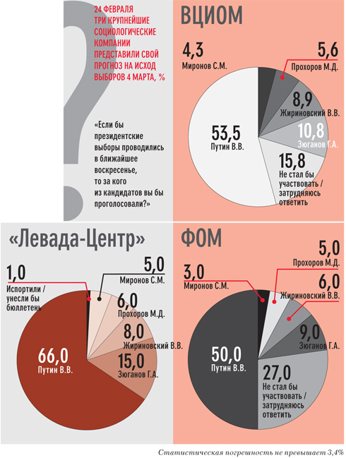 люди, которые не участвуют, заранее согласны с любым результатом. Не согласен с коллегами политолог Станислав Белковский: «Путин победит в первом туре любой ценой и получит не менее 55%. Вопрос только в легитимности выборов. Но чем выше, а значит, абсурднее будет результат Путина, тем шире будет протест. Идти надо не 4-го на участки, а 5-го — на улицы».