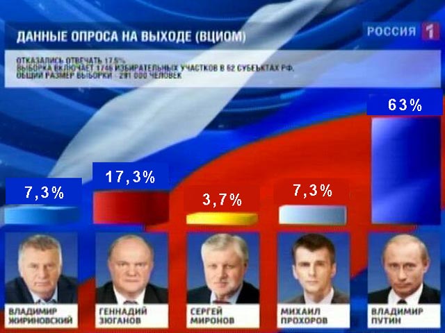 Путин, который идет уже на третий президентский срок, победил с меньшим перевесом, чем в 2004 году, но с большим, чем в 2000-м, обобщает ИТАР-ТАСС, ориентируясь на данные экзит-поллов (опроса граждан социологами на выходе с избирательных участков). Цифры ВЦИОМ таковы: Путин набрал 58,3% голосов (52,94% в 2000-м году и рекордные 71,73% - в 2008-м). По данным Фонда "Общественное мнение" (ФОМ), у Путина 59,3%.
