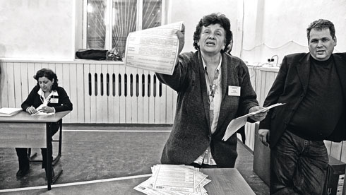 Члены комиссии подсчитывают голоса за ЖириновскогоЧужие Оказавшись внутри комиссии, испытываешь странное ощущение. Кажется, вот-вот ухватишь что-то существенное и поймешь, где происходят фальсификации. Ан нет. Комиссия — это семья, все члены которой хорошо знают правила игры и чужаков к себе не подпускают. На лишние вопросы не отвечают. И только случайно удается заметить, какой «суп» здесь варится. Вот, например, пожилая учительница младших классов из школы на Ленинском проспекте жалуется: директор заставила всех взять открепительные и в обязательном порядке приехать в воскресенье голосовать на работу. «Директриса говорила, что надо поставить галочку за Путина. А я вот возьму и проголосую за другого», — храбрилась учительница. Спрашиваю: зачем она в выходной тащится на Ленинский, когда можно проголосовать здесь же, на Сретенке. «Могут уволить, а куда ж я пойду?» — ответ, который в последний месяц я слышала десятки раз.