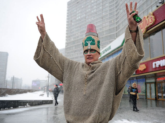 Сотрудники правоохранительных органов Москвы задержали на Красной площади мужчину, который, будучи одетым весьма странным образом, вел себя неадекватно. В холщовом рубище и с красной мигалкой на голове мужчина гулял у стен Кремля и "веселил" туристов и горожан, сообщил "Интерфаксу" источник в правоохранительных органах. Произошло это в воскресенье, когда неподалеку, в ГУМе, были задержаны полуголые активисты "Партии любви".