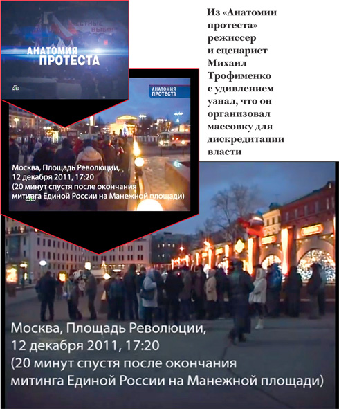 Эти кадры оказались использованы в «Анатомии протеста» — Трофименко с удивлением узнал, что, оказывается, это он сам организовал и подкупил массовку, чтобы дискредитировать власть и «Единую Россию». Теперь Трофименко думает, подавать ли ему в суд на НТВ. Причина его сомнений в судебном успехе заключается в том, что там же, у метро «Площадь Революции», где он снял массовку для провластного митинга, Трофименко познакомился с неким Александром: у молодого человека на куртке был значок движения «Наши», но он представился журналистом и обменялся с Трофименко телефонами под предлогом того, что сможет «подкинуть материала». Накануне первого выхода «Анатомии протеста» на экраны Александр позвонил Трофименко и предложил 19 марта снять материалы к футбольному дерби ЦСКА — «Спартак», поинтересовался, сколько будет стоить работа двух операторов в течение четырех часов с 17.00 до 21.00. Режиссер посоветовался с коллегами и назвал цену: 12 тыс. рублей. Теперь Михаил Трофименко опасается, что в случае судебного разбирательства НТВ представит в суд аудиозапись этого разговора как доказательство того, что он работал за деньги и организовал массовку возле Манежной. The New Times связался с таинственным Александром, и он подтвердил, что работает журналистом, в прошлом был связан с НТВ и в скором времени намерен вернуться на канал, а также с угрозой в голосе предложил встретиться тет-а-тет поздно вечером и рассказать «много интересного о том митинге».