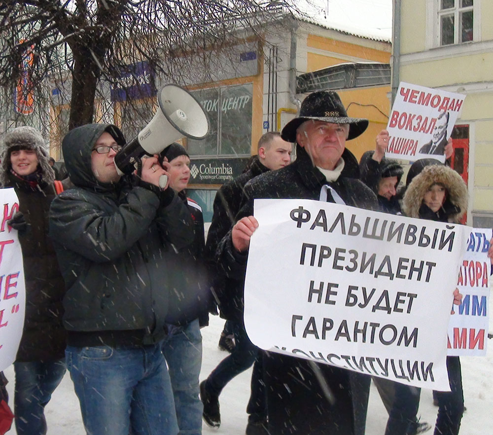 Участники акции демонстрировали плакаты "Губернатором - рязанца!", "Рязань без Ковалева!", "Чемодан - вокзал - Кашира", "Хотим сами выбирать губернатора", "Фальшивый президент не будет гарантом Конституции" и другие.