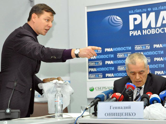 "Украина вырастила Вас, ведь Вы учились в Донецке, но Вы не помните свои корни. Чтобы Вы вспомнили, я принес Вам колбасу с Бессарабского рынка", - сказал Ляшко. После чего стал выкрикивать в адрес главы Роспотребнадзора оскорбительные выражения. Онищенко в ответ назвал депутата "хамом" и вышел из зала пресс-конференций.
