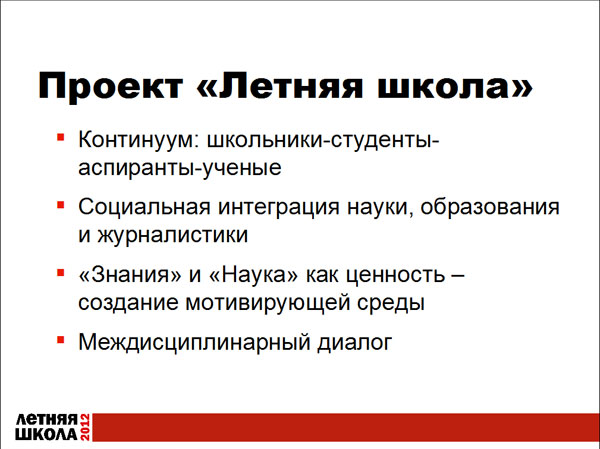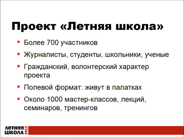 Очень быстро про «Летнюю школу». Не буду описывать это, палаточный проект в лесу, изолированный от всех, не финансированный никем. Довольно массовый, мы в этом году ждем около 1000 человек. И основная идеология - это перемешать журналистов с не-журналистами.