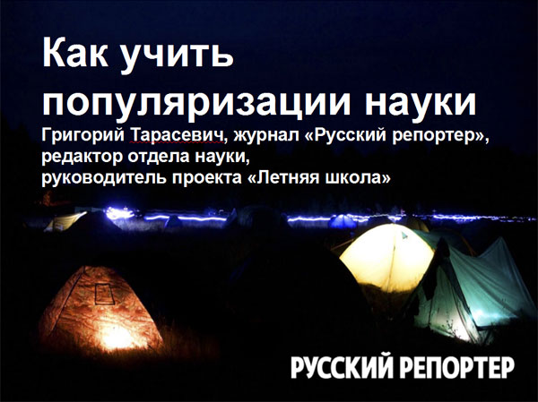 Мы публикуем материалы форума «Научная журналистика: особенности профессии и возможности обучения», проведенного Немецким культурным центром им. Гёте в Москве в рамках проекта «Популярная наука» 5 марта 2012 г. Редактор отдела науки журнала «Русский Репортер» и руководитель проекта "Летняя школа" Григорий Тарасевич рассказывает о том, как учить популяризации науки.
