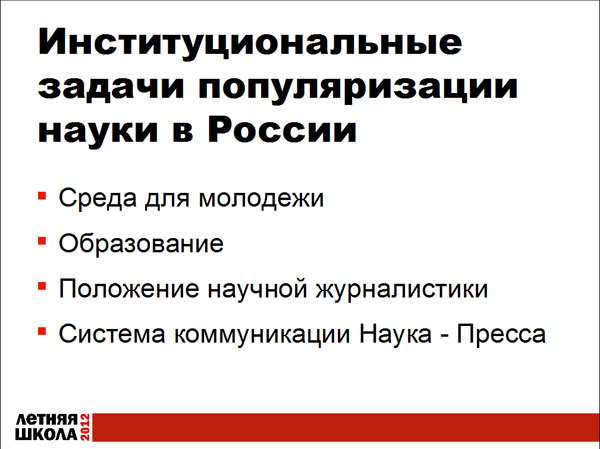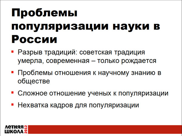Вопрос из зала: Григорий, я бы хотел прокомментировать один момент, уже как ученый, а не как журналист. Вот там, где написаны проблемы, почему часто ученые не идут, почему мы не пишем пресс-релизы. Ответ в том, на мой взгляд, что там есть комплекс проблем. Журналистика для науки не стала четвертой властью. То есть журналисты ученому в России не нужны. Подумайте, что важнее для финансирования университета: что Вы про него напишите или то, что ректор – член Единой России? Ответ известен. Точно также у нас существует тезис, что наука – это удовлетворение личного любопытства за государственный счет. В принципе, это неправильная вещь. Вообще говоря, должно быть, что я, условно говоря, делегирую какому-нибудь молекулярному биологу удовлетворять мое любопытство за государственный счет, а он будет просто выполнять роль… он и свою удовлетворит, и мою, и других. И тогда мы все вместе посмотрим и решим, если он делает что-то интересное, мы его финансируем. У нас финансирование науки устроено так, что Public Relations для фундаментальной науки, финансируемой государством, абсолютно не важны. И поэтому у нас в стране, если посмотреть на все опросы элит, популярных людей, там нет ученых или есть люди, которые известны благодаря своей популяризаторской деятельности, как Сергей Капица, например. И вот видите ли Вы какой-то способ со стороны научной журналистики влиять на это, то есть не убедить ученых, что им надо идти, просто потому что надо, как в стихотворении Пригала, а вот именно поменять систему функционирования науки в стране, чтобы ученые реально были заинтересованы в контакте?