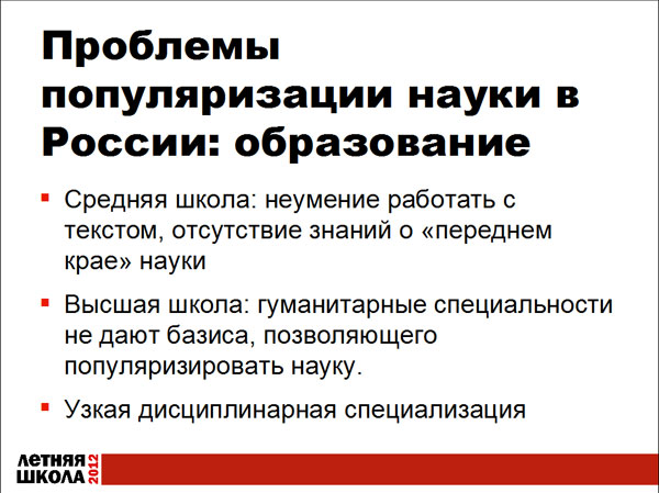 Еще одна проблема характерная для нашего образования и усугубляющаяся – это очень жесткая специализация. В школе, слава Богу, она пока не такая жесткая. Но будет, скорее всего, более четкой. Здесь очень четко загоняют человека в рамки. Ты – журналист, и поэтому про биологию ты не узнаешь никогда. Для журналистов есть предмет, я читал несколько учебников по этому предмету, проглядывал, называется «Современные концепции естествознания». Это поразительный предмет, поразительное явление, может быть мне преподаватели объяснять, почему это. Ну, смотрите, там объясняют базовые вещи, связанные с устройством физического и биологического мира. На уровне журфака, даже на уровне специализированного ВУЗа, эти вещи уже более менее однозначны. Уже понятна более-менее стандартная модель работы клетки, работы гена. Там это подносится с разных сторон, это именно концепции. Есть разные концепции живого. А в психологии одна. То, что реально психология не договорилась, существует в формате многих школ, есть психология необихевиористская, есть психология психоаналитическая. Они, конечно, пытаются сливаться, но до конца не получается. Психология – одна, а естествознаний много, концепции. И это все, что студент журфака имеет право знать про естественные науки. Больше ничего он права знать не имеет. Точно так же как студент биолог не имеет права знать ничего про лингвистику, про историю и про кучу других вещей, которые могут иметь отношение к его деятельности.