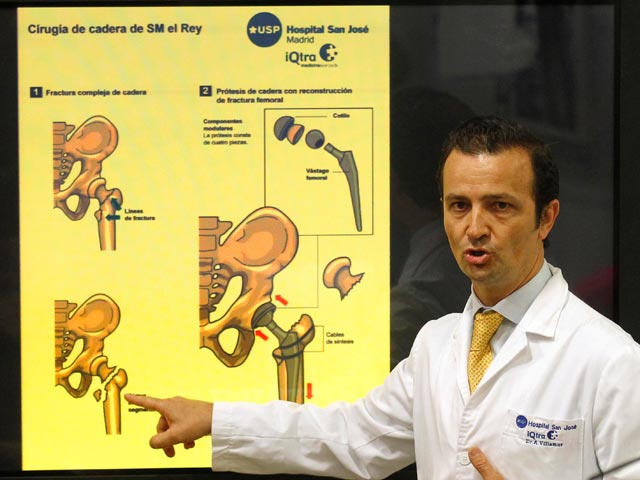 Как рассказала на пресс-конференции хирург Ангела Вийамор, сложность процедуры заключалась в том, что было принято решение одновременно с устранением последствий перелома установить протез тазобедренного сустава в рамках лечения артрита. Король операцию перенес хорошо. Первую ночь после операции Хуан Карлос уже спокойно спал без обезболивающих, а спустя 24 часа встал с кровати, опираясь на костыли, уточняет NEWSru Israel.