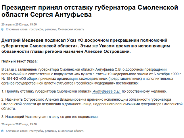 Президент России Дмитрий Медведев принял отставку губернатора Смоленской области Сергея Антуфьева, о которой как о состоявшемся факте заговорили еще накануне. Сам глава регионов свою отставку до последнего не подтверждал. Тем удивительнее, что ушел он, по официальной версии, абсолютно добровольно.